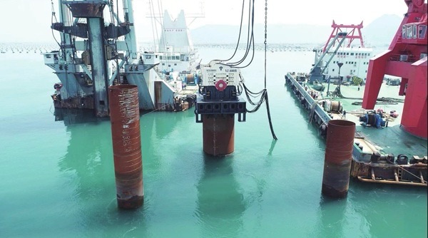 为应对原配IHCS800型液压冲击锤正在施工中可能对大黄鱼养殖区形成的冲击波影响,团队自从立异研发“打桩船﹢液压振动锤”集成沉桩工艺,将ICE170NF液压振动锤取雄程3号打桩船连系,实现高频低噪功课,既降低了对生态的扰动,又保障了施工精度,展示了工程取的双赢。